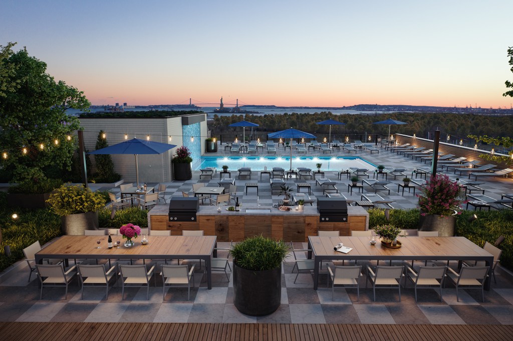 Social and recreational facilities exclusive to renters in the second Vantage building include a 45th floor Sky Lounge, fully-equipped fitness center, yoga studio, children’s playroom, business center, co-working lounge with private work pods, game room, media room, sculpture garden, covered parking, dog wash and more. In addition, a 6th floor activities deck shared with its sister building will provide access to two sparkling pools, a basketball court, great lawn, fire pits, 12-station BBQ area, outdoor children’s play area, dedicated outdoor dog run, outdoor fitness area, terrace and bar, shared gardening beds, and lounge and tiered seating. Hotel-inspired services include 24-hour attended lobby, lobby lounge, Amazon package lockers, bicycle storage and more.