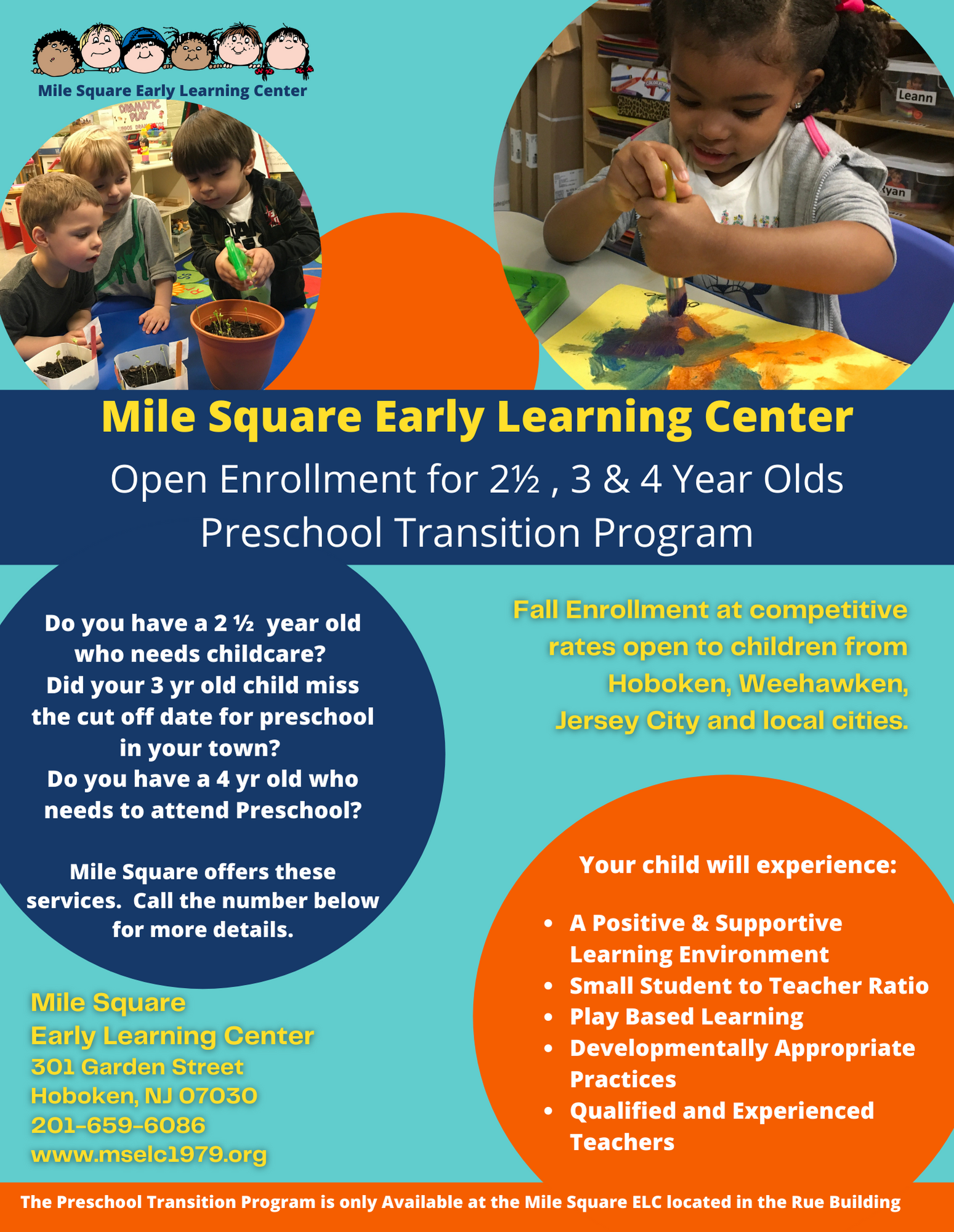 For additional program information, rates and how to register your child, please visit http://www.mselc1979.org or call 201-659-6086. Although there is no deadline for enrollment in the Mile Square Early Learning Center Preschool Transition Program; However, space is limited and will be available on a first come first basis. In addition, many families ask about access to rolling over into the Hoboken Public School’s Early Childhood Program so we are providing information here about the registration process for that program.