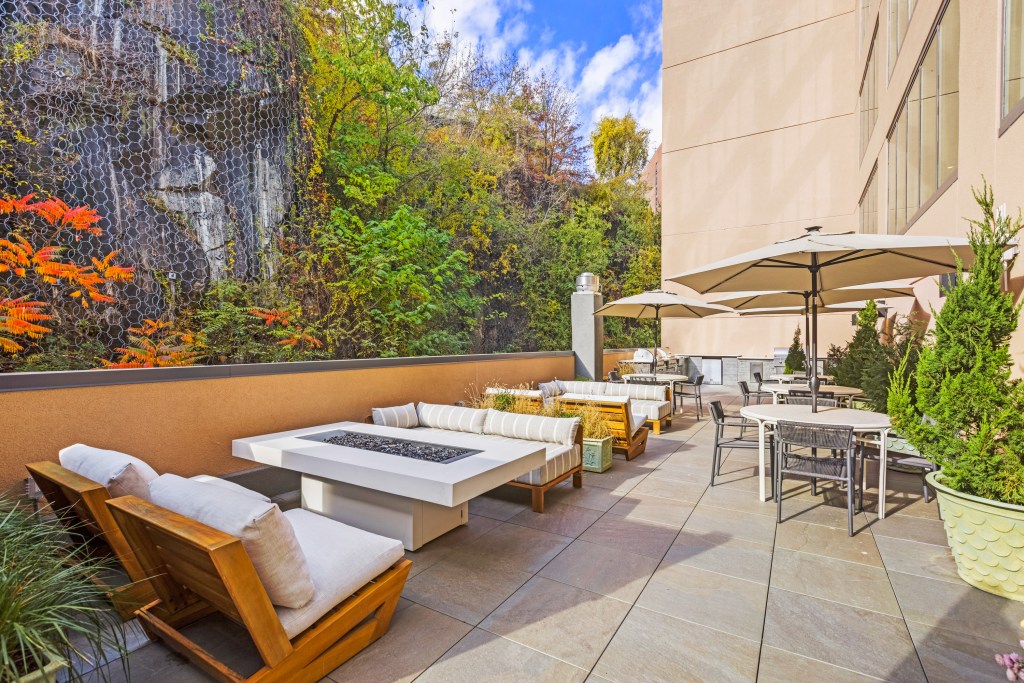 Other amenities include a co-working space with private conference room, and a resident lounge featuring a fireplace, billiards, demonstration kitchen and event space. Outside, there’s also a dog run and a cliffside roof deck with a custom outdoor kitchen, BBQs, dining areas, firepits and lounge seating.