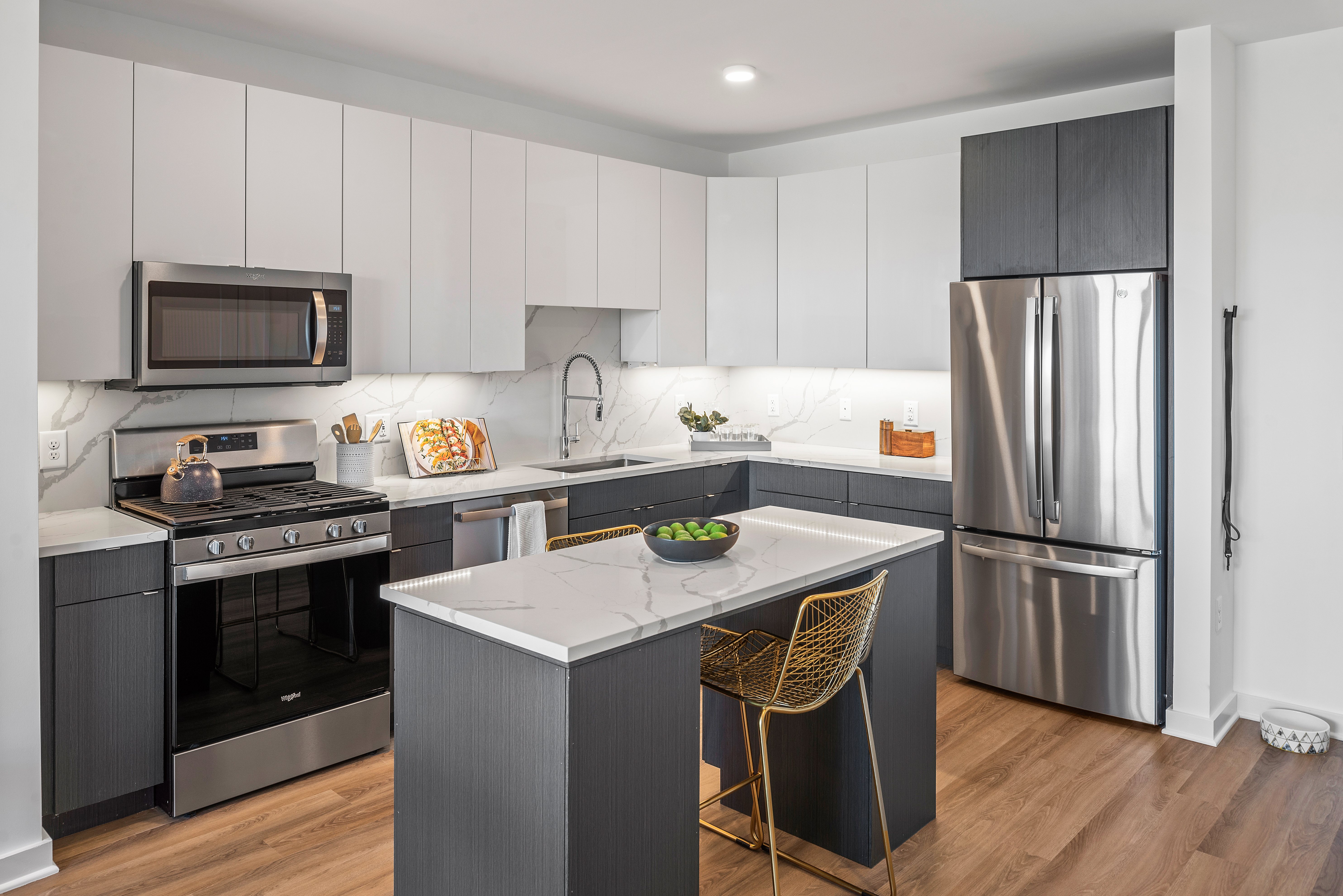 Stylish homes at Ivy and Green offer nine-foot ceiling heights, oversized windows with complimentary treatments, and in-home washer and dryer. Designer kitchens boast stainless steel appliances, gas ranges, French door refrigerators, and quartz countertops and backsplashes-that create a luxurious and sophisticated aesthetic. Lavish baths are adorned with tiled walls and illuminated vanity mirrors. Select homes offer balconies or terraces to extend the living space outdoors.