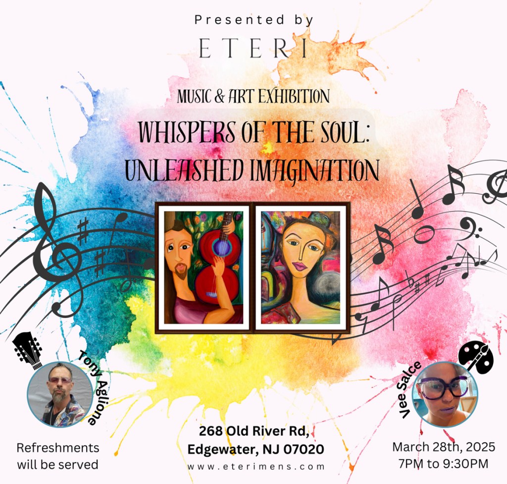Whispers of the Soul: Unleashed Imagination, a music and art exhibition, will be coming to Edgewater on Friday, March 28th. The event will take place from 7PM to 9:30PM at 268 Old River Rd with art from painter Vee Salce and music from guitarist Tony Aglione.