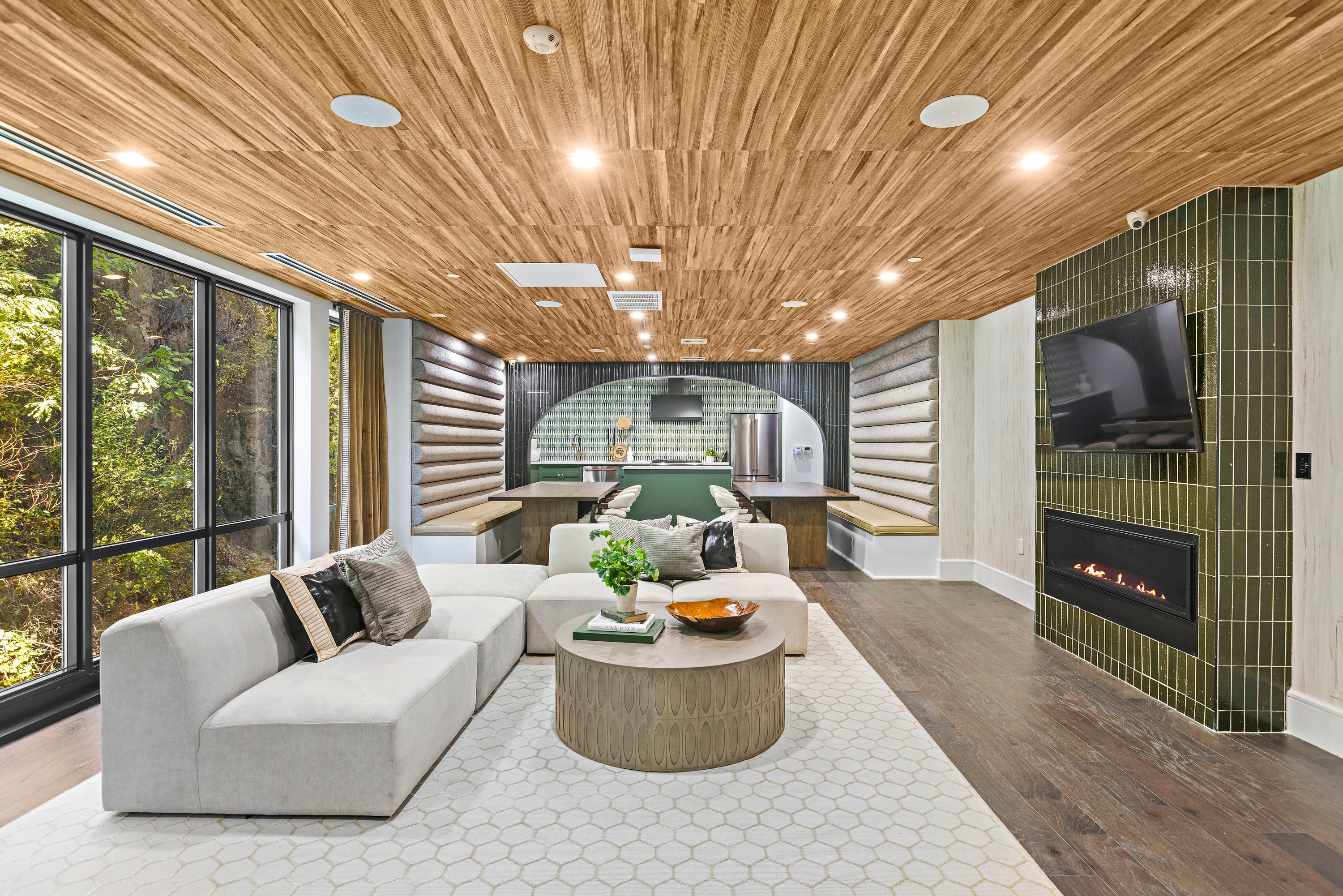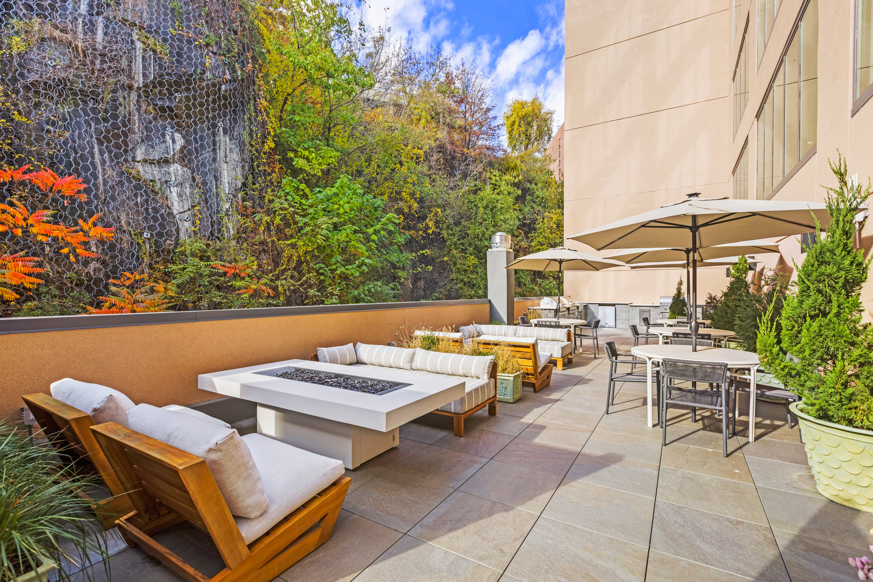 Additional amenities include a co-working space with a private conference room and a resident lounge complete with a fireplace, billiards, demonstration kitchen, and event space. Outdoors, residents enjoy a dog run and a cliffside roof deck featuring a custom outdoor kitchen, BBQ grills, dining areas, fire pits, and lounge seating. On-site covered parking is available, and all amenities are accessible 24/7, year-round.