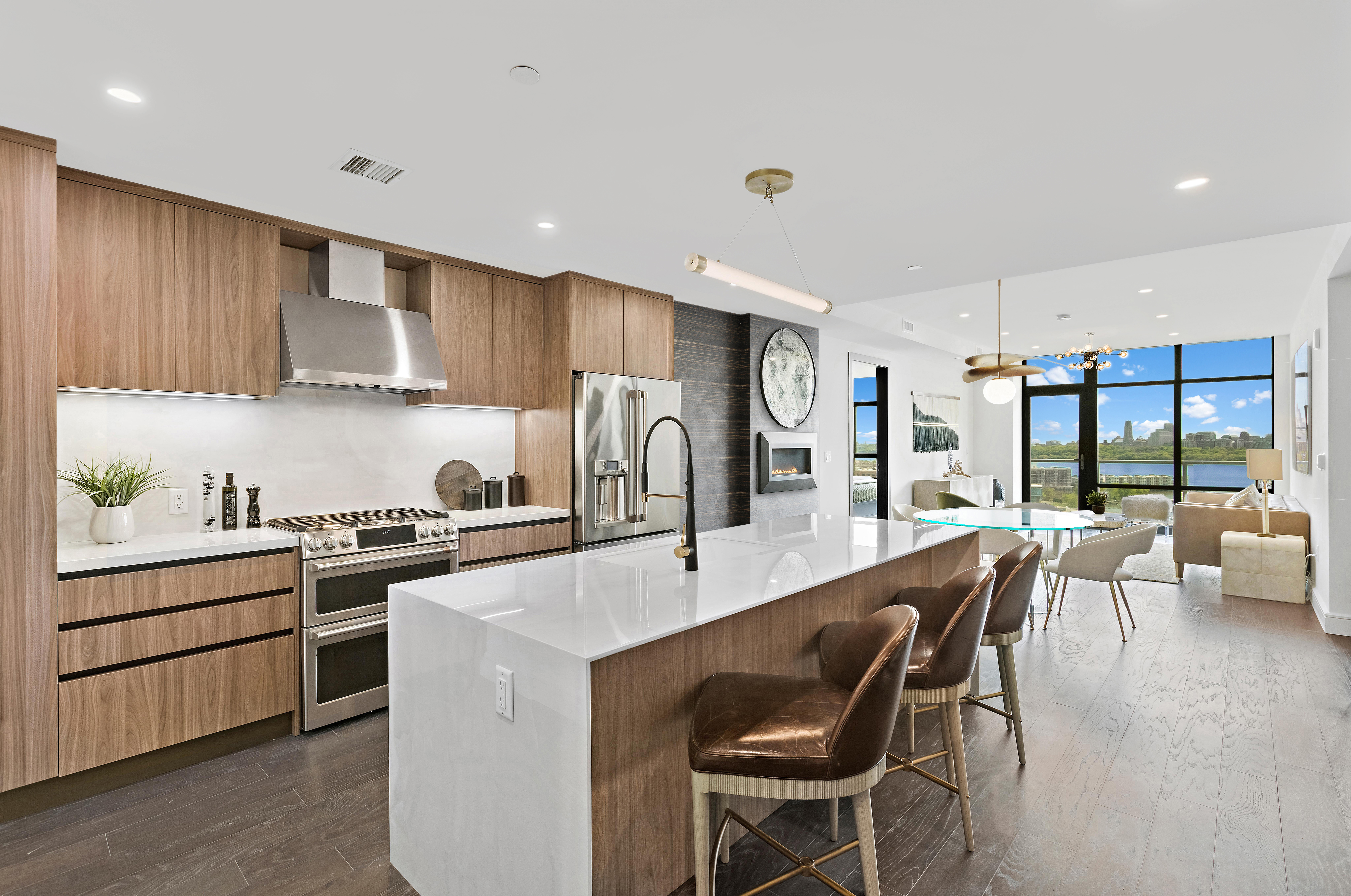Designed for modern luxury, the spacious layouts showcase expansive, energy-efficient windows, rich dark espresso flooring, in-home, full-size washers and dryers, and spacious living rooms with gas fireplaces. Gourmet kitchens boast custom Italian cabinetry, SapienStone countertops with elegant waterfall islands, and GE Café Wi-Fi-enabled appliances. The primary bedrooms impress with custom closet systems and lavish five-fixture en-suite baths featuring Seedwood tile accent walls and oversized soaking tubs. Advanced smart home features, including lighting, thermostats, and Latch keyless entry, enhance convenience throughout residences and amenities.