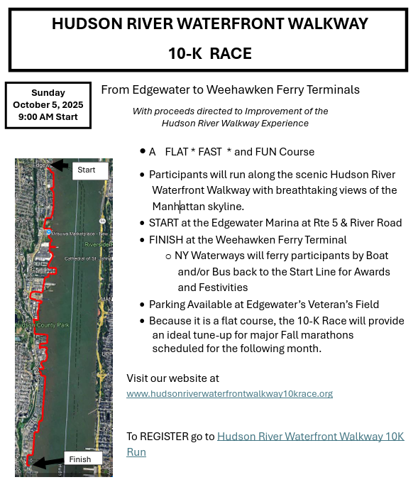 As posted on edgewaternj.org, the Hudson River Waterfront Walkway 10k Race will take place Sunday, October 5. The race will start in Edgewater and finish in Weehawken, allowing for breathtaking views of the Manhattan Skyline. Check out the two flyers below: