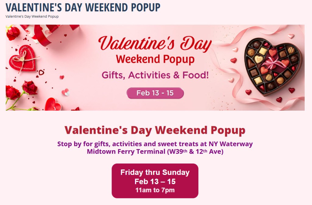 NY Waterway is hosting a special Valentine’s Weekend Pop‑Up from February 13–15, offering gifts, sweet treats, and themed activities for ferry riders traveling between New Jersey and New York. The pop-up runs from 11 AM to 7 PM each day at the midtown terminal and is a fun, convenient way for Gold Coast commuters to add a little festive spirit to their daily travel.