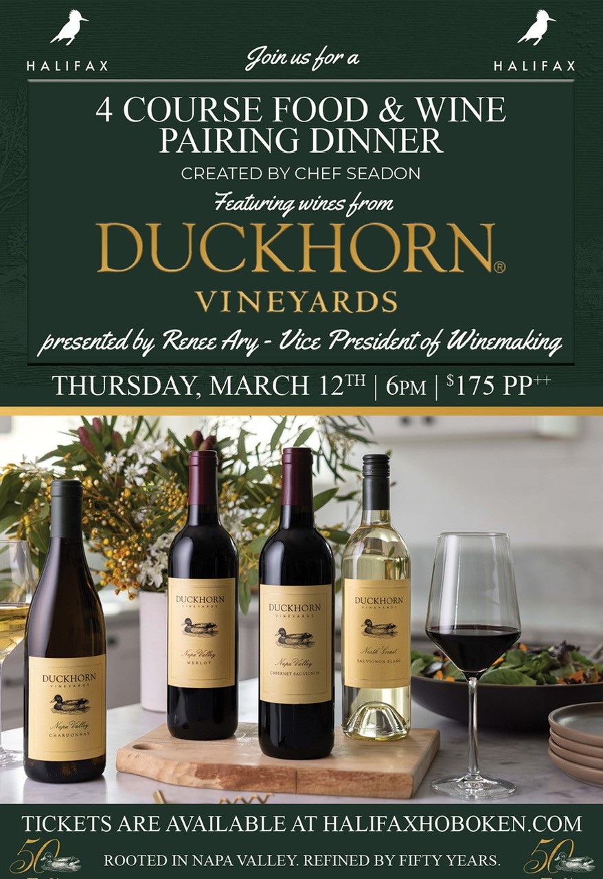 Halifax Restaurant in Hoboken will host a special four-course Duckhorn Vineyards wine pairing dinner on Thursday, March 12, bringing together seasonal cuisine and acclaimed Napa Valley wines for an intimate evening of food, wine, and conversation.